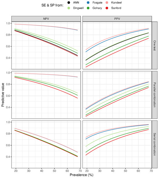 Predictive values. The black curve represents the ANN-based negative (NPV) and positive predictive values (PPV) as a function of subclinical mastitis prevalence. Based on sensitivity (SE) and specificity (SP) values of California Mastitis Test (CMT) published by Dingwell et al. [27], Fosgate et al. [29], Gohary et al. [16], Kandeel et al. [30], and Sanford et al. [28] estimated predictive values are shown by colored curves. In the first row of the figures (one test), the curves represent the predictive values using SE and SP of the individual tests (ANN or CMTs). The following two rows of figures show the predictive values obtained by combining ANN and CMT. The second row of figures shows their parallel combination, and the third row their serial combination.