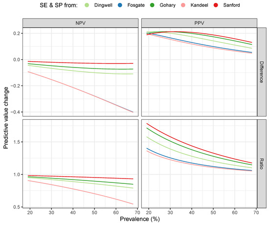 Prediction changes by serial combination. The curves show the predictive value changes of the ANN+CMT combination against CMT as a function of subclinical mastitis prevalence. The color of the curves indicates the literature source of the used CMT SE and SP values (Dingwell et al. [27], Fosgate et al. [29], Gohary et al. [16], Kandeel et al. [30], and Sanford et al. [28]). In the top row, the curves show the absolute difference between the ANN+CMT prediction values and the CMT prediction values, while in the bottom row, their ratios.
