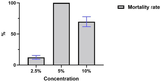 All concentrations of ethanolic extract from the industrial residue of andiroba showed some degree of acaricidal activity. The lowest concentration (2.5%) had a limited larval mortality rate of around 12.38% (±3.5), but the 5% solution showed the most promising results, causing the death of 100% of the larvae in all tests. The 10% solution exhibited intermediate results, causing 69.79% (±7.97) mean larval mortality (Figure 2).