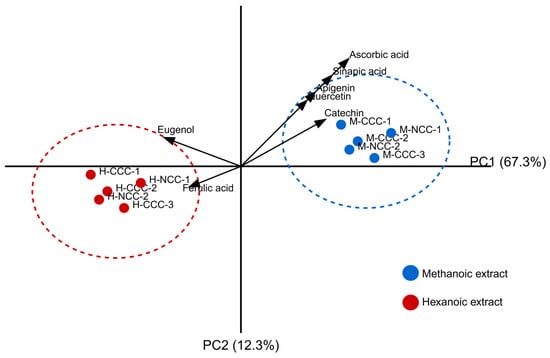 Figure 1. Principal component analysis of phytochemical composition in Takhrai leaf extracts. Biplot showing the distribution of methanolic (M) and hexanoic (H) extracts from commercial (CCC) and non-commercial (NCC) Takhrai cultivated in different geographical regions.