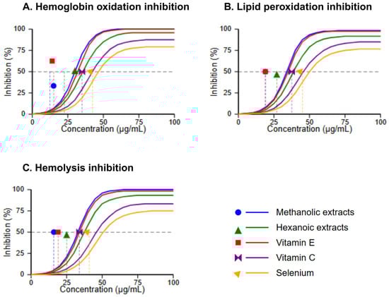 The ability of extracts to inhibit hemoglobin oxidation was assessed by measuring methemoglobin formation following exposure to 2,2′-azobis(2-amidinopropane) dihydrochloride (AAPH), a peroxyl radical generator [21]. Extract solutions were prepared at sixteen concentrations (1–500 μg/mL) in PBS. One hundred microliters of each concentration were added to 200 μL of erythrocyte suspension (1250 × 106 cells/mL) in a 96-well plate and incubated at 38 °C for 30 min with gentle agitation (50 rpm). Subsequently, 200 μL of AAPH solution (100 mM in PBS, yielding a final concentration of 50 mM) were added, and the mixture was incubated at 38 °C for an additional 4 h. Following incubation, the samples were centrifuged (1500× g, 6 min, 4 °C), and 300 μL of supernatant were transferred to a fresh 96-well plate. Methemoglobin formation was quantified by measuring absorbance at 630 nm.