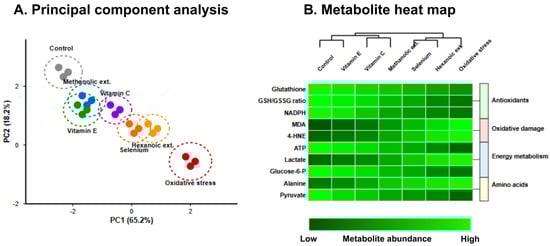 Figure 3. Metabolomic profiling of treated erythrocytes. (A) Principal component analysis of metabolite abundances shows clustering of methanolic extract treatment with vitamin E and control conditions, distinct from oxidative stress and hexanoic extract treatments. (B) Heatmap visualization with hierarchical clustering of metabolomic profiles reveals preservation of antioxidant metabolites (glutathione, NADPH, ATP) and attenuation of oxidative damage markers (MDA, 4-HNE) by methanolic extracts at levels comparable to vitamin E treatment. Color intensity represents metabolite abundance relative to control conditions, with principal components explaining 83.4% of total variance.