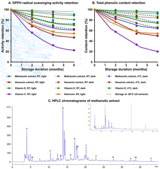Figure 4. Stability of Takhrai extracts under different conditions. (A) DPPH radical scavenging activity retention and (B) total phenolic content retention over 6 months of storage under different temperature and light conditions. Values represent mean ± SD (n = 12). RT = room temperature (25 °C). Light = normal laboratory lighting conditions (400–700 lux, 12 h cycle). Dark = stored in amber containers protected from light. (C) Representative HPLC chromatograms of methanolic extract stored over 6 months at different storage conditions. Peak identifications: ascorbic acid (A), gallic acid (B), catechin (C), caffeic acid (D), syringic acid (E), rutin (F), p-coumaric acid (G), sinapic acid (H), ferulic acid (I), myricetin (J), quercetin (K), apigenin (L), kaempferol (M), and eugenol (N). Refer to Table 2 for quantitative analysis of compound-specific retention percentages under all storage conditions.