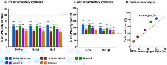 Figure 5. Immunomodulatory effects of Takhrai extracts. (A) Suppression of pro-inflammatory cytokines (TNF-α, IL-1β, IL-6) in LPS-challenged goat PBMCs, showing superior anti-inflammatory effects of methanolic extracts compared to hexanoic extracts and commercial antioxidants. Dotted line represents cells treated with LPS alone (positive control for inflammation) without any antioxidant pre-treatment. (B) Enhancement of anti-inflammatory cytokines (IL-10, TGF-β) by various treatments. (C) Correlation analysis demonstrating strong positive relationship (r = 0.87, p < 0.001) between DPPH radical scavenging activity and TNF-α suppression, suggesting a mechanistic link between antioxidant capacity and anti-inflammatory effects. Values represent mean ± SD (n = 12). * p < 0.05, ** p < 0.01, *** p < 0.001 vs. LPS alone.