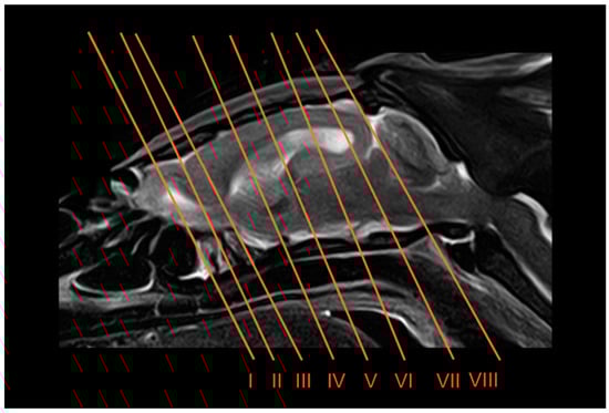 Paramedian T2W MR image of the six-banded armadillo showing the approximate levels of transverse slices. Each number represents the approximate location for each CT and MR transverse (I to VIII) images.