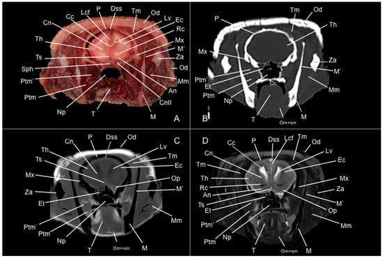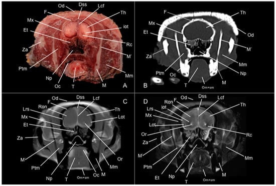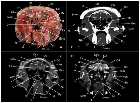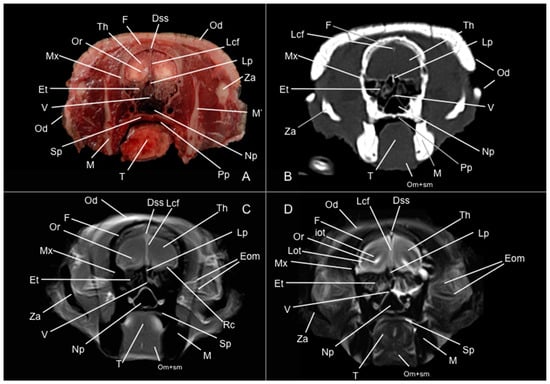 Anatomical section (A), CT bone window (B), T1W (C), and T2W (D) MR images of the head of a six-banded armadillo (armadillo 1) at the level of the olfactory recess, corresponding to line II in Figure 1. Dss: sinus sagittalis dorsalis. Eom: extraocular muscles. Et: ethmoturbinalia. F: os frontale. iot: tractus olfactorius intermedius. Lcf: fissura longitudinalis cerebri. Lot: tractus olfactorius lateralis. Lp: lamina perpendicularis (os ethmoidale). M: mandible (body). M’: mandible (ramus). Mx: maxilla. Np: nasopharynx. Od: osteoderm. Om+sm: musculi omohyoideus + sternohyoideus. Or: olfactory recess. Pp: plexus palatinus. Rc: commissura rostralis. Sp: soft palate. T: lingua. Th: telencephalon hemispherium (frontal lobe). V: vomer. Za: arcus zygomaticus.