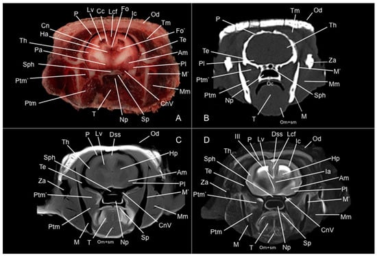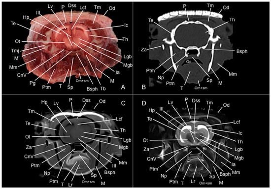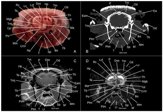 The sections that best corresponded with the CT and MR images were selected to assist in identifying key structures of the six-banded armadillo’s head. Additionally, consultation with textbooks and relevant references on the anatomy of armadillos and other mammals was required [,,,,,,,,,,,,,,,,,,,,,,,,,,,,]. We named most of these structures in compliance with the International Committee on Veterinary Gross Anatomical Nomenclature. English terms were used when referring to broader concepts, functional aspects, or when Latin equivalents are not commonly used in the literature or clinical context. This mixed approach aims to balance anatomical precision with readability and is consistent with the practice adopted in several recent anatomical and veterinary studies [,,,,,,,,].