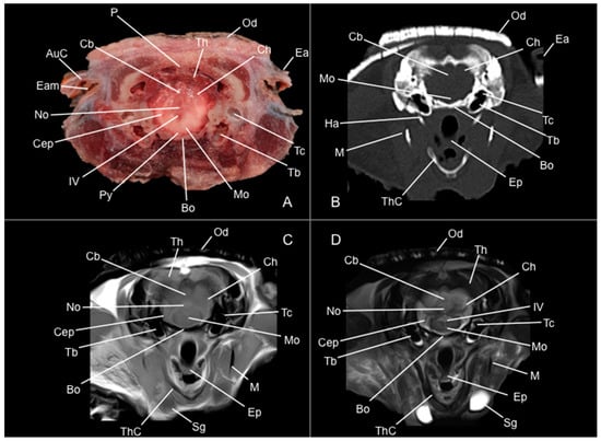 Anatomical section (A), CT bone window (B), T1W (C), and T2W (D) MR images of the head of a six-banded armadillo (armadillo 3) at the level of the fourth ventricle, corresponding to line VIII in Figure 1. AuC: cartilago auriculae. Bo: basioccipital. Cb: cerebellum (body). Cep: pedunculus cerebellaris (medius). Ch: cerebellum hemispherium. Ea: ear. Ep: epiglottis. Ha: apparatus hyoideus (os hyoideum). IV: fourth ventricle. M: mandible. Mo: medulla oblongata. No: nodulus. Od: osteoderm. Py: pyramis. Sg: glandulae salivariae. Tb: bulla tympanica. Tc: cavum tympani. Th: telencephalon hemispherium (occipital lobe). ThC: cartilago thyroidea.