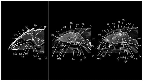 On the more caudal transverse and sagittal MR images, we distinguished the colliculi (with exceptional development of the colliculus caudalis) and the pedunculus cerebri with adequate resolution (Figure 8D and Figure 10C,D). Close to these peduncles, we could visualize the genicular bodies, showing intermediate signals (Figure 7C,D, Figure 8D, and Figure 10D). Other relevant formations of the nervous system, including the vermis and the cerebellum hemisphaerium, the pedunculus cerebellaris medius, and the medulla oblongata, were displayed in the T1 and T2W images (Figure 9C,D, Figure 10C,D, and Figure 11D).