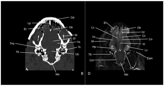 MRI images were also pivotal to appreciate diverse eyeball components, such as the humor vitreus and lens, and the extraocular muscles (Figure 2C,D and Figure 3C,D), displaying moderate or high intensity signals. Additionally, we accurately pinpointed different muscles responsible for the chewing movement of the mandible and the articulatio temporomandibularis, including the lateral and medial pterygoid muscles and the masseter and temporal muscles, which presented moderate intensity signals in T1 and T2W transverse images (Figure 4C,D, Figure 5C,D, Figure 6C,D, Figure 7C,D and Figure 8C,D).