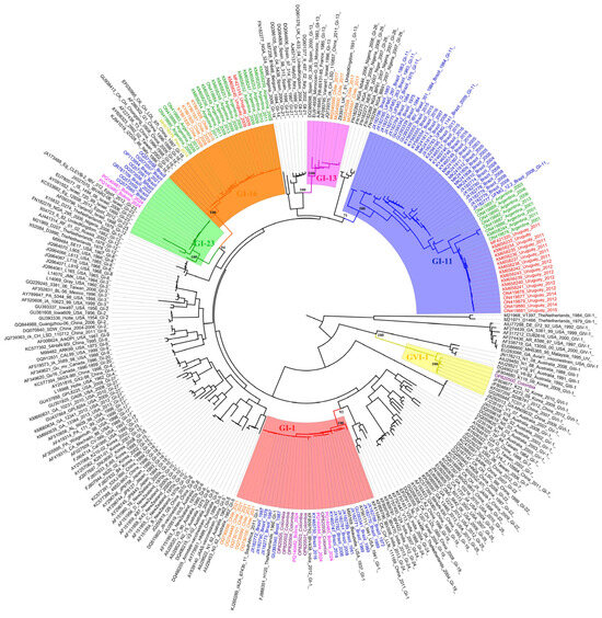 The current IBV classification is based on complete S1 gene sequencing. IBV is classified into nine genetic types (GI to GIX) and at least 41 (1 to 41) lineages defined through comprehensive studies that analyzed samples from different parts of the world. The nine genetic types represent significant variations in the viral genome sequence, reflecting evolution and adaptation to different hosts and geographic environments. In addition, lineages are subdivisions within these genetic types, reflecting more specific variations that have arisen over time due to mutation and genetic recombination [6,25,26]. IBV GI is most associated with outbreaks of infectious bronchitis on commercial poultry farms and is present in virtually all commercial poultry production sites worldwide, with the following lineages showing significant presence by geographic region: GI-1, -12, -13, -14, -16, -19, -21, -23, and -26 in Africa; GI-1, -2, -3, -4, -7, -13, -15, -18, -19, -22, -24, -28, and -29 in Asia; GI-1, -12, -13, -16, -19, and -23 in the Middle East; GI-1, -12, -13, -14, -16, -19, -21, and -23 in Europe; GI-1, -2, -3, -8, -9, -17, -25, and -27 in North America; GI-1, -5, -6, and -10 in Oceania; and GI-1, -9, -11, -13, -16, -17, -23, and -30 in South America [25,27].