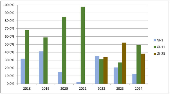 Percentage distribution of IBV genetic groups GI-1, GI-11, and GI-23 over the years (2018–2024) in Brazil. The Y-axis represents the percentage of occurrence, while the X-axis indicates the years analyzed. The blue bars correspond to the GI-1 group, the green bars to the GI-11 group, and the brown bars to the GI-23 group. There is a variation in the prevalence of the groups over time, with emphasis on the peak of GI-11 in 2021 and the increase in GI-23 in more recent years.