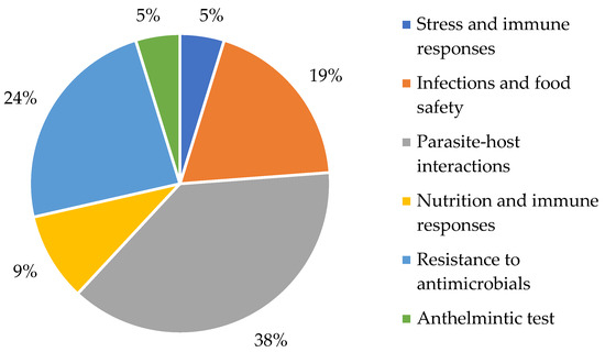 The One Health approaches used in the 21 articles that constituted the sample were divided according to their objectives and rationales discussed in the body of the text into parasite–host interactions (38%; [46,47,48,49,50,51,52,53]), antimicrobial resistance (24%; [8,54,55,56,57]), infections and food safety (19%; [9,58,59,60]), nutrition and immune responses (9%; [61,62]), stress and immune responses (4%; [10]) and anthelmintic testing (4%; [63]) (Figure 2).