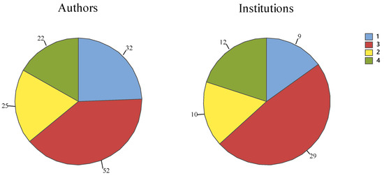 The number (frequency) of authors and the number of institutions in the articles in relation to the number of CAPES Areas of Knowledge (1, 2, 3 or 4 different areas) self-declared in the affiliation of the systematic review articles (https://www.gov.br/capes/pt-br/acesso-a-informacao/acoes-e-programas/avaliacao/instrumentos/documentos-de-apoio/tabela-de-areas-de-conhecimento-avaliacao, accessed on 28 March 2024).