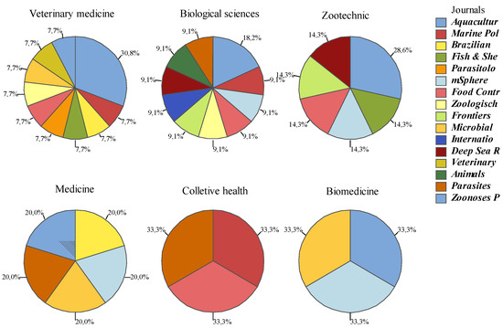 The journals Parasitology Research and Veterinary World had only articles published in the area of veterinary medicine, International Journal of Food Microbiology and Animals had only articles published in the area of biological sciences, Frontiers in Marine Science and Deep Sea Research Part I: Oceanographic Research Papers had articles published in the areas of animal science/fishery resources and biological sciences, and Brazilian Journal of Veterinary Medicine and Zoonoses and Public Health had articles published in the areas of medicine and veterinary medicine (Figure 5).