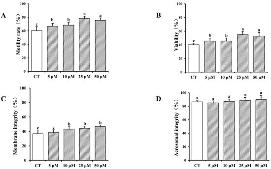 Impact of various concentrations of curcumin (ranging from 0 to 50 µM) on the viability, motility, plasma membrane, and acrosome integrity of chilled bovine sperm following freezing and thawing. (A) Frozen–thawed sperm motility. (B) Viability of frozen–thawed sperm. (C) Plasma membrane integrity of sperm after freeze–thawing. (D) Acrosome integrity of frozen–thawed sperm. A total of four replicates were performed. Identical letter notation signifies no significant difference (p > 0.05) and different letter notation denotes a significant difference (p < 0.05).