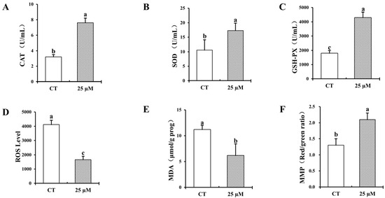 Figure 2 presents the effect of adding curcumin to bovine cryopreservation solution on the antioxidant properties of frozen–thawed bovine sperm. The introduction of 25 µM curcumin into cryopreserved semen markedly enhanced the activities ofantioxidant enzymes, including CAT, SOD, and GSH-PX, and significantly reduced the content of ROS and MDA, while enhancing the mitochondrial membrane potential of frozen–thawed bovine spermatozoa (p < 0.05).