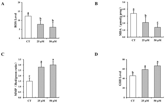 As shown in Figure 4, the addition of 25 and 50 µM curcumin to IVM medium significantly increased the GSH content and MMP levels of bovine oocytes and significantly reduced the content of ROS and MDA (p < 0.05). Notably, the MDA content of the 50 µM curcumin group was significantly reduced compared to the 25 µM curcumin group (p < 0.05), and other antioxidant indices were not significantly different between the two groups (p > 0.05).