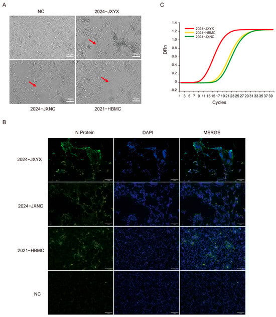 Isolation and characterization of the PEDV strains 2021-HBMC, 2024-JXNC and 2024-JXYX. (A) Vero cells were infected with the 2021-HBMC, 2024-JXNC, or 2024-JXYX strain for 24 h; the cytopathic effect was observed using a microscope, and the red arrows indicate the syncytium area. (B) Vero cells were infected with the 2021-HBMC, 2024-JXNC, or 2024-JXYX strain for 24 h and were detected using an immunofluorescence assay. (C) Detection of PEDV-N gene expression levels of generation 5 was carried out using RT-qPCR.