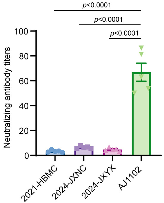 3.2. Neutralization Titer of AJ1102 Immune Serum Against Isolated Strains Is Significantly Reduced