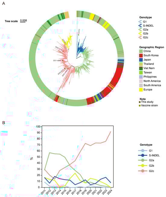 Genotyping of the PEDV strains based on S gene sequences from 2010 to 2024. (A) The S gene phylogenetic tree was generated by Mega7.0 using the Neighbor-Joining method with 1000 bootstrap replicates. The evolutionary branches of different genotypes are colored, and isolation countries are shown by different color blocks of leaves. (B) The isolation rate of each genotype in China from 2011 to 2024 was counted and is represented by line graphs.