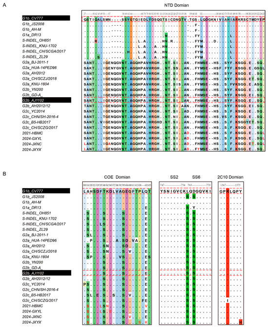 Amino acid variation in G2c strains isolated in this study in the S protein. The spike sequences of 2021-HBMC, 2024-GXYL, 2024-JXNC, and 2024-JXYX and the reference strains were aligned with Mega7.0, and the sites with variation were spiced using jalview 2.11.4.1. (A) Analysis of amino acid variations in the NTD region. (B) Analysis of amino acid variations in the COE, SS2, SS6 and 2C10 domain.