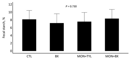 No significant differences were observed between treatments (p = 0.730; Figure 1) for fecal starch percentage during the finishing phase.