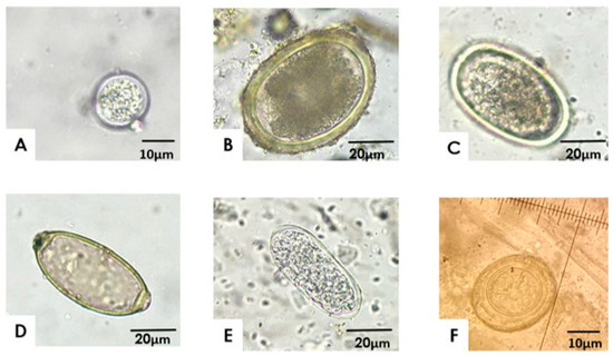 Microscopic analysis used qualitative coprological examination methods, concentrating parasitic elements (oocysts from parasitic protozoa and eggs from gastrointestinal helminths). The collected feces were homogenized, and 5 g of feces was examined using standard flotation methods [16]. A saturated sodium chloride flotation solution (1.2 Mean Specific Gravity) was prepared. Briefly, each sample was sieved into a plastic tube filled with saturated sodium chloride solution and covered with a coverslip. After 10 min, the coverslip was carefully removed, placed over a glass slide, and analyzed microscopically to detect the presence of eggs or oocysts. Samples were examined under a light microscope using 10× and 40× objectives, with a calibrated ocular micrometer employed to measure the eggs’ dimensions and classify them by genus and species [17]. This method was performed in duplicate for each sample.