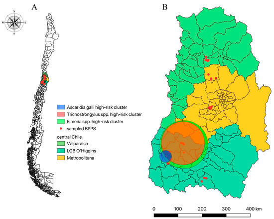Spatial distribution of sampled BPPS from central Chile, showing (A) a general view of the study area; (B) the studied regions, showing the distribution of sampled BPPS within the three studied regions and spatial location of statistically significant high-risk clusters for Eimeria spp. presence (green circle), Trichostrongylus spp. presence (clear red circle), and Ascaridia galli presence (blue circle).