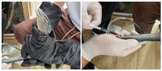 Blood samples were obtained by the zoo veterinarians as part of the veterinary checks-ups carried out on these species at the zoo. All individuals were fasted for 24 h before sampling. For veterinary handling, it was necessary to capture and restrain the animals using protective gloves specifically designed for handling reptiles. Two veterinarians were required to perform the blood collection: one to restrain the animal and the other to collect the blood (Figure 1). Previous studies have reported that 0.4–0.8 mL of blood per 100 g of body weight can be safely collected from healthy Varanus [13]. Given that the mean weight of the study individuals was 244 g, 1 mL of blood was collected by caudal venipuncture at the base of the tail via a ventral midline approach using a 25-gauge needle attached to a 1 mL heparinized syringe (Fibrilin 20 IU/mL; Laboratorios Rovi; Madrid, Spain) after disinfection of the area with 96° sanitary alcohol.