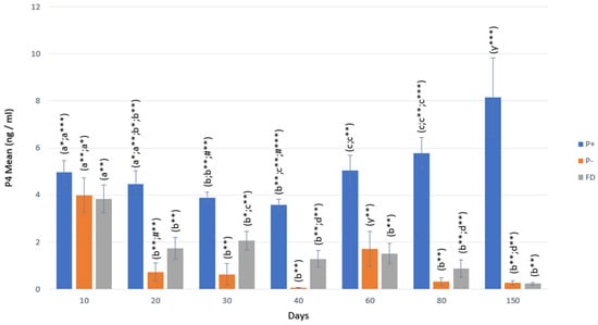 In terms of P4 concentrations, a rapid decrease (0.73 ng/mL) was observed in P− animals starting from the 20th day, while P4 concentrations remained above 1 ng/mL (1.73 ng/mL) in FD animals on the 20th day. Starting from the 20th day until the 40th day, the P4 value remained below 1 ng/mL in P− animals, while the value was above 1 ng/mL in FD animals (p < 0.01). On the following days, i.e., days 80 and 150, no statistically significant difference was identified between the two groups. There was no statistically significant difference between P− and FD in terms of AMH and Hp concentrations in any period (Table 2).