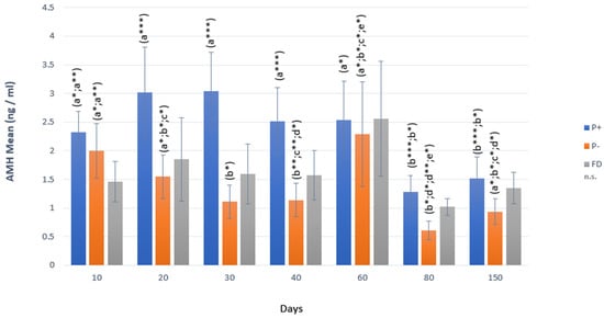 AMH changes in P+, P−, and FD by days. Different letters or asterisks indicate differences between days (a:b:c:d:e*; p < 0.05; a:b:c:d**; p < 0.01; a:b***; p < 0.001).