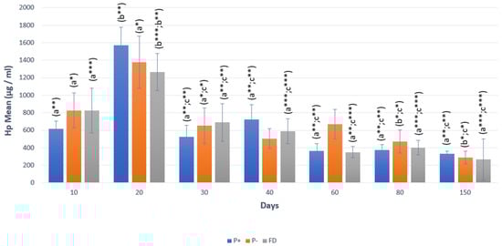 After a significant increase in Hp concentrations, especially on day 20 of pregnancy (p < 0.001), significant decreases were observed starting from day 30 of pregnancy until the 150th day (p < 0.001). Similarly, Hp concentrations in FD showed the same change as in pregnancy. In P− animals, significant decreases in Hp concentrations were observed on days 80 and 150 (p < 0.05; Figure 3).