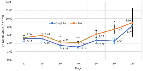 Comparison of P4 concentrations in single and twin pregnancies (single offspring; n = 11); twin offspring (n = 8). Different asterisks indicate differences between days (* p < 0.05; ** p < 0.01).