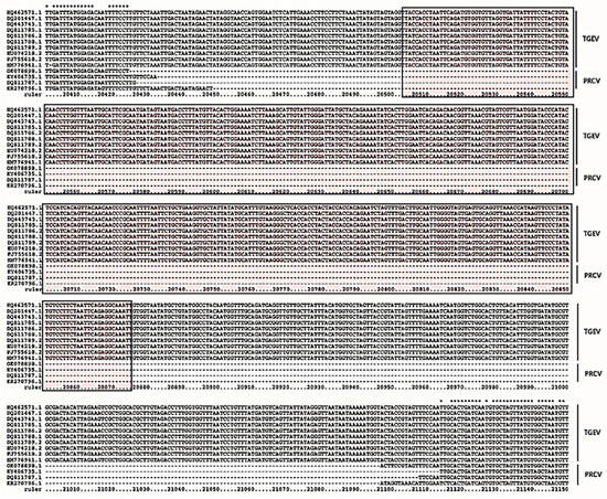 Partial sequence alignment of the S genes in different TGEV and PRCV strains; the consensus sequence within the box is the target sequence for detection. (Red mark) A 362 bp consensus nucleic acid sequence used for constructing the TGEV–puc57 recombinant plasmid.