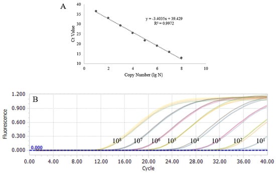 Sensitivity validation of qPCR. (A) Ten–fold serial dilutions of the TGEV plasmid were used as the template to construct the standard curve for qPCR. (B) Ten–fold serial dilutions of the pUC57–TGEV plasmid were used as the template for sensitivity detection in qPCR.