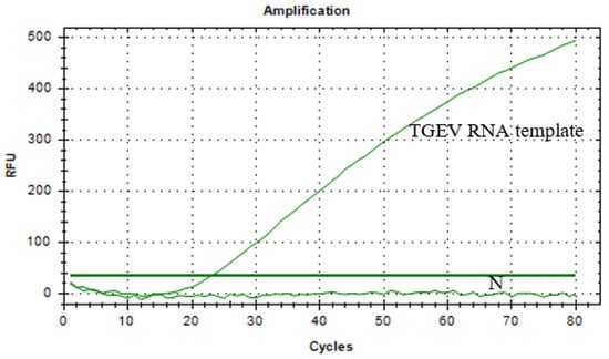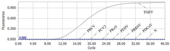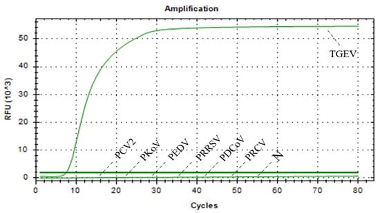 A TaqMan qPCR method for detecting porcine TGEV was developed based on the screened target sequence of the S gene (sequence site: 20,517–20,879; GenBank ID: DQ811785). The detection limit of the qPCR method for the standard plasmid was 41.3 copies/μL (Table 3). The construction of the standard curves demonstrated a strong linear correlation (R2 = 0.9972, y = −3.4035lgN + 39.429) between the Ct values and the corresponding copy numbers of the target sequence in the TGEV S gene (Figure 2). Specificity evaluation revealed that the qPCR method produced an amplification curve exclusively for TGEV (Figure 3), and the coefficient of variation (CV) values for the nine detection tests at different concentrations of the standard plasmid were all below 1.5% (Table 3).
