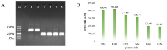 Determination of optimal primer pairs for the RAA method. (A) Optimal primer pairs were identified with the RAA method. (B) Image J analysis tool was used to evaluate the primer pairs and determine the most suitable one. M: DL500 DNA Marker; N: negative control; 1–6: primer pairs—F1/R1, F1/R2, F2/R1, F2/R2, F3/R1, and F3/R2, respectively.