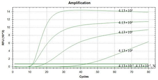 Sensitivity test results of plasmid templates with concentrations ranging from 4.13 × 103 to 4.13 × 10−2 copies/µL, detected with RAA–CRISPR/Cas13a.