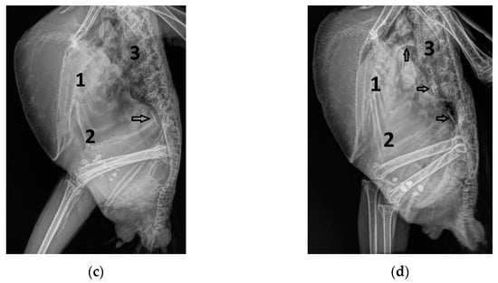 Laterolateral radiographs of Congo grey parrots with atherosclerosis: (a) with a hyperdense aorta without calcifications (arrow) and a normal heart silhouette (GP from group 2); (b) with a hyperdense aorta with calcifications (arrow) and a normal heart silhouette (GP from group 1); (c,d) with hyperdense aorta with varying degrees of calcifications (arrow) and signs of heart failure, such as an enlarged heart silhouette, lung edema, and an enlarged liver silhouette due to effusion into the hepatoperitoneal cavity (GP from group 3); 1: heart silhouette; 2: liver; 3: lungs.