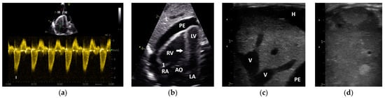 Sonographic findings of Congo grey parrots: (a) Insufficiency of the right atrioventricular valve (AVright) due to an enlarged right ventricle, with PW Doppler sonographic diastolic blood flow profile of the AVright with a systolic insufficiency jet (I) with a very short acceleration phase; H: hepatoperitoneal cavity effusion. (b) End-diastolic movement of the septum in the direction of the left ventricle (arrow), as seen with B-Mode echocardiography; PE: pericardial effusion; RV: right ventricle; LV: left ventricle; RA: right atrium; LA: left atrium; AO: aorta; L: liver; 1: AVright. (c) B-Mode sonography of a congested liver associated with right heart failure, with compacted liver tissue and highly congested liver veins (V); H: hepatoperitoneal cavity effusion; PE: pericardial effusion. (d) B-Mode echocardiography of a liver with nodular liver tissue associated with the shape of the pulmonary blood flow profile, which had a short acceleration phase (outlier group 1).
