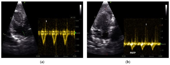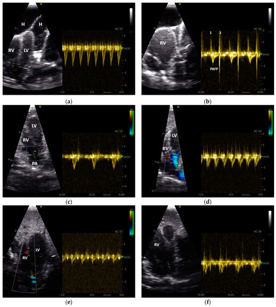 - Arkles, J.S.; Opotowsky, A.R.; Ojeda, J.; Rogers, F.; Liu, T.; Prassana, V.; Marzec, L.; Palevsky, H.I.; Ferrari, V.A.; Forfia, P.R. Shape of the right ventricular Doppler envelope predicts hemodynamics and right heart function in pulmonary hypertension. Am. J. Respir. Crit. Care Med. 2011, 183, 268–276. [Google Scholar] [CrossRef]