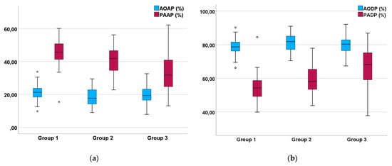 The investigations of the Doppler sonographic images of the diseased GPs revealed that the PAFPs were significantly different between the three groups (PAAP of group 1 to 2: p ≤ 0.05; group 1 to 3: p < 0.001; group 2 to 3: p = 0.004; Mann–Whitney U test). The longest PAAP was detected in cases without sonographic evidence of heart disease (group 1). Cases with an increasing involvement of the right heart in heart failure showed a significantly shorter PAAP and a longer PADP (group 1 to 2: p ≤ 0.05; group 1 to 3: p < 0.001; group 2 to 3: p = 0.009; Mann–Whitney U test). This could also be seen in group 2, with only cases with sonographic evidence of left heart failure showing a significantly shorter PAAP than cases without heart disease (group 1). These results are illustrated graphically in Figure 7. In contrast to the PAFP, the AOFP did not significantly vary between the different groups of diseased GPs (p > 0.05; Mann–Whitney U test; Figure 7).