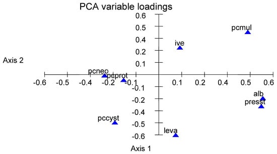 Relationship between the protostrongylid fauna and number of anthelmintic treatments based on principal components analysis (PCA). Codes: alb: albendazole, ive: ivermectin, leva: levamisole, presst: number of treatments per year, pcmul: percentage of Muellerius capillaris, pccyst: percentage of Cystocaulus ocreatus, pcneo: percentage of Neostrongylus linearis, and cprot: percentage of Protostrongylus rufescens.