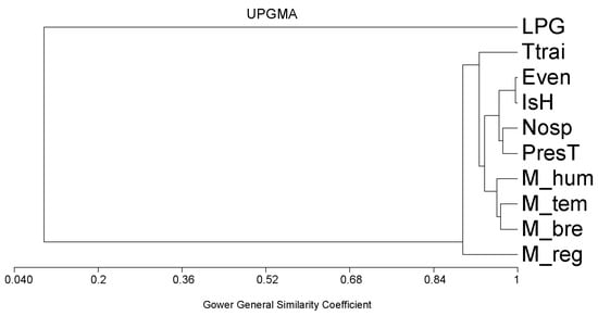 Protostrongylid intensity of infection (LPG) and diversity of species in relation to region, climate, and anthelmintic regimen based on cluster analysis with UPGMA (unweighted pair group method with arithmetic mean). Codes: LPG: larvae per gram of faeces, M_bre: sheep breed, M_hum: bioclimate, M_temp: subtype based on winter temperature, presT: number of treatments per year, nosp: number of protostrongylid species, Ish: Shannon index, even: evenness, and Ttrai: time to last treatment.