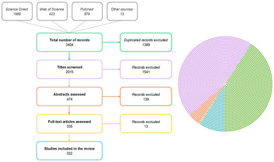 The initial database comprised 3404 references (Figure 1), of which duplicate references (1389) were excluded. The titles and abstracts were assessed, resulting in the exclusion of 1541 and 139 references, respectively. Titles were excluded if they clearly referred to non-experimental studies, non-swine species, or topics unrelated to intestinal health. Abstracts were excluded if they were not related to intestinal health or if they referred to review articles or in vitro studies. Full texts were excluded when the methods or outcomes were not clearly described, when the study was not conducted in pigs, or when the article was not available in English. Later, 335 papers were fully evaluated individually by three members of the team. Any additional removal was discussed with the team and, if accepted, was registered in the PRISMA flow diagram. After this last phase, 322 publications were selected, and all relevant information related to the proposed theoretical model was transferred from these documents to an electronic spreadsheet.