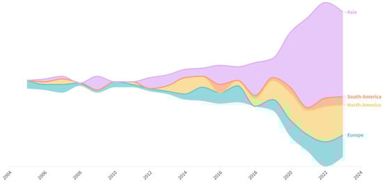 Timespan of publications on pig gut health and regional contributions to the database. As a reference for scale, 3 studies were published in 2005, and 60 studies were published in 2022.