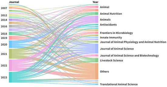 Distribution of publications on pig intestinal health across journals (right) and years (left) from 2007 to 2023. Each color represents a different journal, with “Others” grouping journals with fewer publications. As a reference for scale, 60 studies were published in 2022 (first axis), and 49 studies were published in the Journal of Animal Science (second axis).