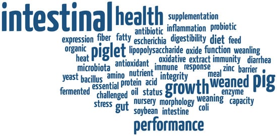 As expected, the most frequently used keyword was intestinal health. Animal growth performance is the primary parameter used to evaluate intestinal health. Other areas of interest include dietary supplements and oxidative stress. The key concepts highlighted in this study were oxidative stress, microbiota, intestinal integrity/morphology, nutrient digestibility, and diarrhea. All of these terms are interconnected. The gastrointestinal tract, together with the liver, is important for the growth, development, and health of farm animals. In the first pass, these organs determine the post-absorptive metabolism of nutrients [12]. Recent studies emphasize that the composition of the gut microbiota or microbiome plays a crucial role in maintaining intestinal health. It influences nutrient absorption, feed digestibility, energy harvest, and consequently animal productivity [6,13,14].