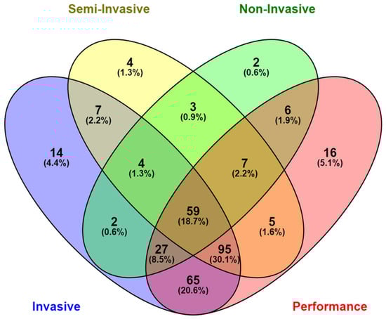Integrating multiple techniques within a single study may enhance the understanding of gut health by providing a broader and more detailed assessment. In this regard, 59 studies (18.3%) combined growth performance measures with invasive, semi-invasive, and non-invasive responses (Figure 6). Invasive and non-invasive responses were combined in only 0.6% of the studies. Corroborating these descriptive results, a significant association (Pearson’s chi-square test for association) was found between invasive responses and growth performance (p < 0.001), as well as between invasive and semi-invasive responses (p = 0.007). However, no association was observed between invasive and non-invasive responses (p = 0.609), indicating that these types of responses do not commonly appear together in these studies.